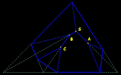 remark: the choice of the first point (for example A) determines the hight of the tectohedron, thus it must be chosen at a distance from the base far greater as the one of the corresponding vertex; we construct the other points gradually (in any direction). The construction becomes more tricky if, on the top view, the vertex S of the tetrahedron has been chosen outside of the base polygon. |